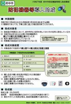 府中市では、東京都防犯機器等購入緊急補助事業を活用し、侵入盗被害防止に有用な防犯機器等の導入により防犯対策を強化すること、防犯意識の醸成と向上を図ることを目的とし、新たな助成事業を開始します。
