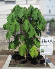 爆心地から北東へ約1.3kmにあったアオギリは、爆心地側の幹半分が焼けてえぐられましたが、成長を続け、焦土の中で青々と芽を吹きました。その後、“平和を愛する心”、“命あるものを大切にする心”を後世に継承するため、この被爆アオギリが実らせた種を発芽させて育て、成長した苗木を「被爆アオギリ二世」と名付けました。
