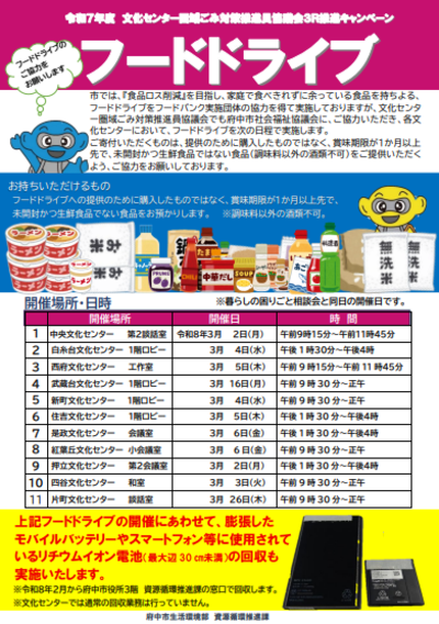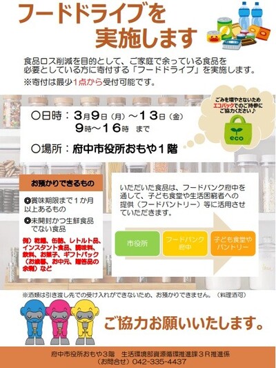 食品ロスの削減を目的として家庭で余っている食品をフードバンク団体を通じて必要としている方に寄付する取組「フードドライブ」を実施しています。