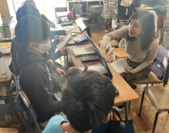 ALTから「「What is your favorite place in 〇〇?」」などの質問があり、児童は一生懸命考え、英語で答えました。また、「I want to visit your city!」といった感想をもらうなど、笑顔を交えて会話をしていました。