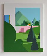 原田郁は、風景や室内を鮮やかな色面で描き出します。光が降り注ぎ影をつくり、さわやかな風が吹き抜けるその空間は、しかしどこか均質で、具体的な場所を示しているわけではなさそうです。実はそれらは原田郁が作り出した仮想の世界で、この10年の年月をかけて徐々に形づくられてきました。