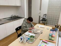 昨年12月から始まった公開制作も、いよいよ今日で終了です。下地としてジェッソを塗った上からアクリル絵具を塗る作業が続いていました。最後に、展示に向けて作品を壁や展示台に配置していきます。壁に立てかけられた合板の端材も、銀色の水場に置かれた色見本も、小木曽さんの感覚が反映された心地よい位置関係です。