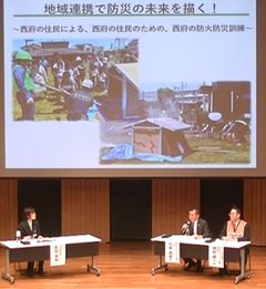 「第30回防災まちづくり大賞」「第22回地域の防火防災功労賞最優秀賞」を受賞された是政文化センター圏域自主防災連絡会副会長 林田 健一氏、「第22回地域の防火防災功労賞優良賞」を受賞された西府文化センター圏域自主防災連絡会会長 松本 良幸氏から、地域防災に関する先進的な取組についてご紹介いただきました。