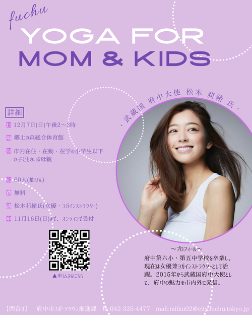 市では、出産や育児等のライフステージの変化により、スポーツを楽しむ機会から遠ざかっている女性が、再びスポーツを始めるきっかけとなるようヨガイベントを開催します。講師に武蔵国府中大使の松本莉緒さんをお迎えします!