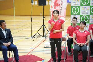 令和7年10月11日(土曜日) フォーリス光と風の広場にて、デフレスリング日本代表の三浦桂吾選手、船川真央選手、練習パートナの梅林太朗氏、手話通訳士の畔上美保子氏をお招きして壮行会を実施しました。