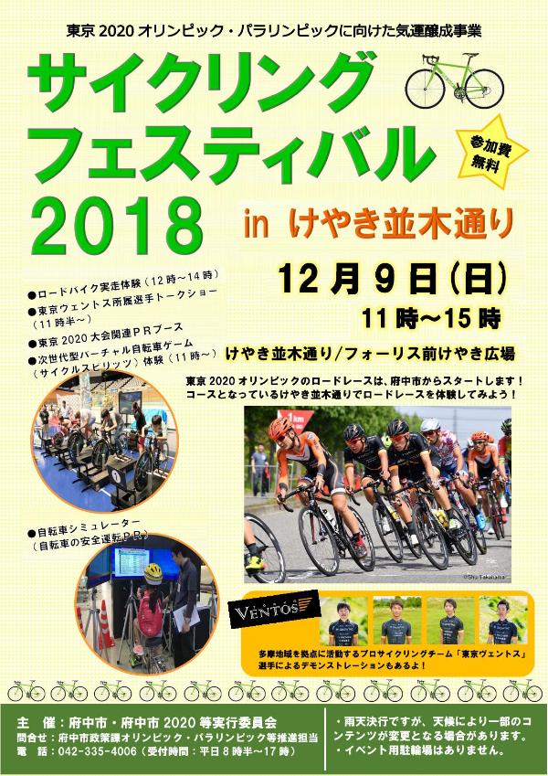 このたび、東京2020大会に向けた気運醸成事業として、「サイクリングフェスティバル2018inけやき並木通り」を開催することになりました。イベントでは、大会時にコースとなるけやき並木通りでのロードバイク実走体験、多摩地域を拠点に活動するプロサイクリングチーム「東京ヴェントス」選手によるトークショーとデモンストレーション、次世代型バーチャル自転車ゲーム(サイクルスピリッツ)体験などを行います。