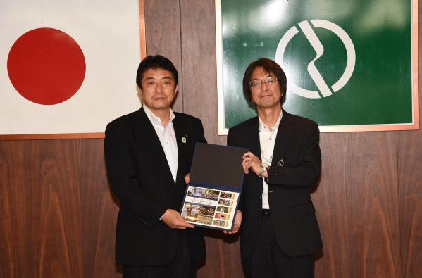 荒若日本郵便株式会社東京支社支社長から高野市長へホストタウンフレーム切手を贈呈いただきました