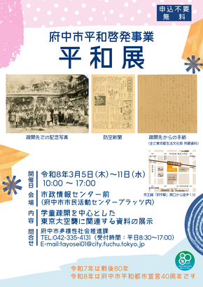 府中市では、市民の方々と平和について学び、考えながら後世に語り継いでいくため、平和啓発事業を実施しています。