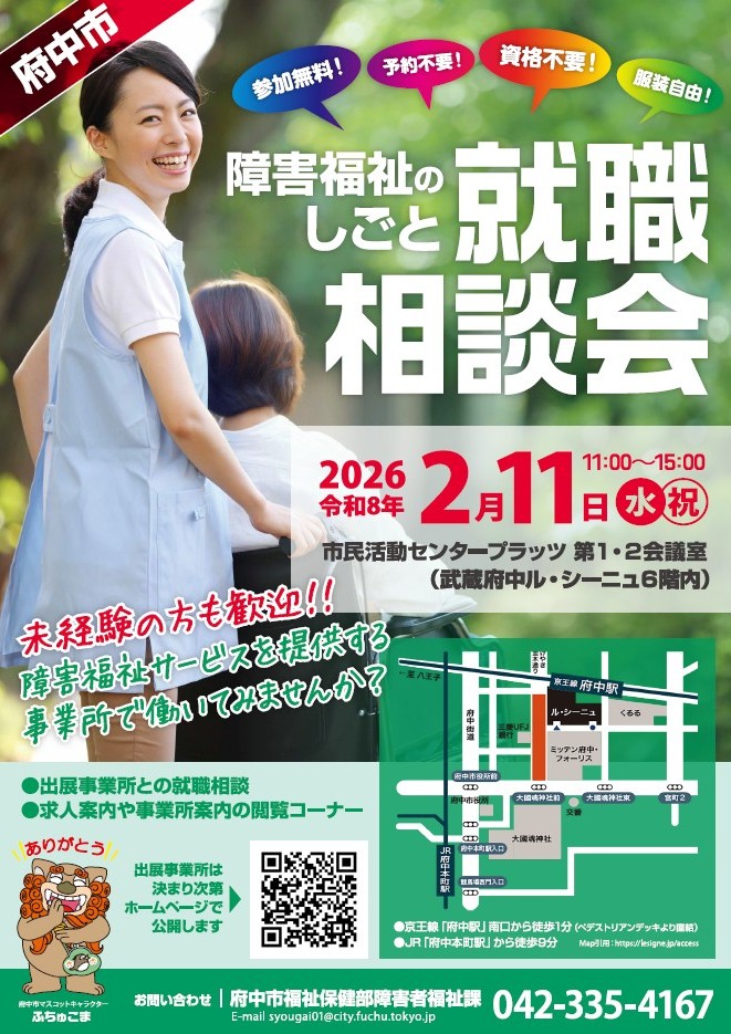 障害福祉の事業所で働いてみませんか。府中市内での就労を考えている方、障害福祉に興味のある方と、市内の障害福祉サービスを提供している事業所の就職相談会を開催します。出展法人と、直接就職の相談ができるほか、出展法人以外の事業所の就職案内やパンフレットを準備して、皆さんのご来場をお待ちしています。未経験の方も、少しでも興味がありましたら是非お立ち寄りください。
