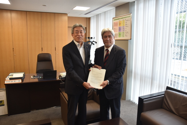 令和7年9月30日(火曜日)に、府中市新総合体育館基本構想検討協議会の木村会長から、府中市新総合体育館基本構想素案の作成についての答申書が、酒井教育長に手渡されました。