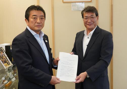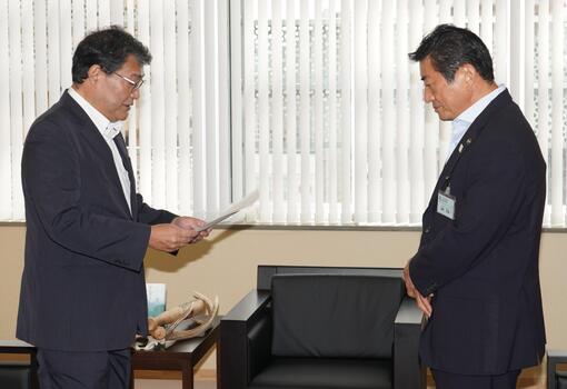令和7年9月16日(火曜日)、府中市下水道事業経営戦略等検討協議会の長岡会長から、府中市下水道事業経営戦略等についての中間答申書が高野市長に手渡されました。