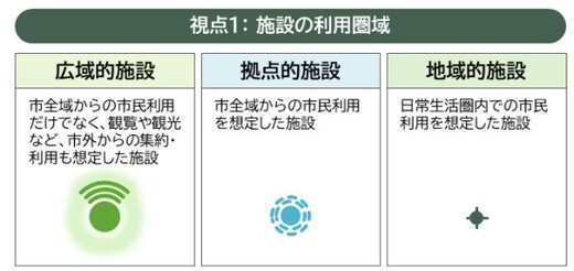 - 広域的施設:移転が決定している総合体育館を除き、原則として現状の配置を維持する。