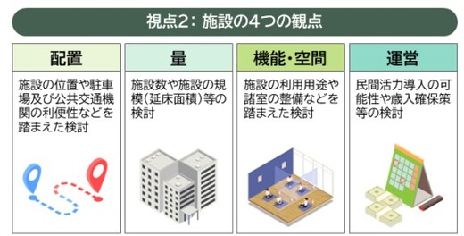 施設の分類ごとに、配置、量、機能・空間及び運営の4つの観点から、基本的な考え方を定めます。