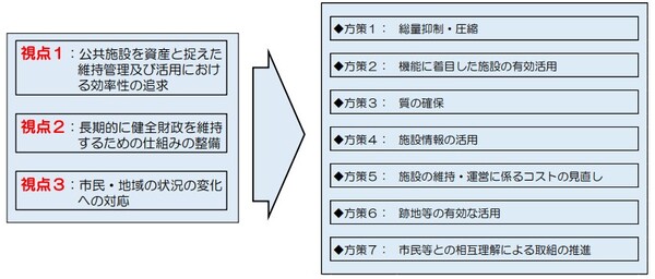 3つの視点と7つの方策に取り組むことにより、効果的に公共施設マネジメントを推進していきます。