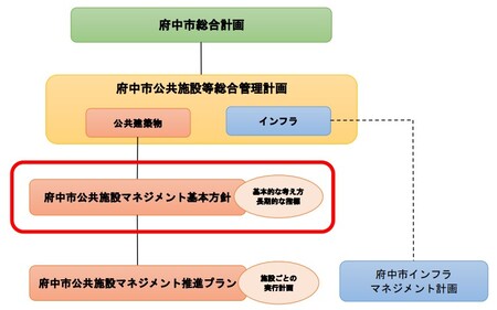 しかし、旧方針を策定してから一定の期間が経過し、国の動きや本市の各種計画との整合を図る必要があることから、本市における公共施設マネジメントの体系を整理した上で、内容の見直しを行い、新たな「府中市公共施設マネジメント基本方針」として改定を行いました。