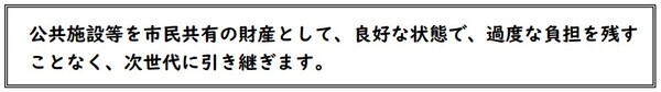 上位計画である府中市公共施設等総合管理計画では、公共施設等を適正に次世代に引き継ぐための目標を掲げていることから、本方針でもその目標に基づいて取組を進めていきます。