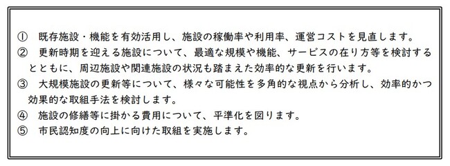 第3次推進プランでも引続き既存施設の有効活用に努めるほか、課題を踏まえて次の5点について取り組みます。