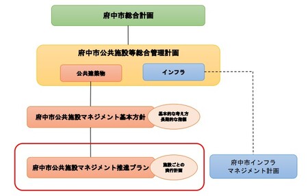 府中市公共施設マネジメント推進プランは、府中市公共施設マネジメント基本方針に基づき、効果的に公共施設マネジメントの取組を推進していくための実行計画として位置付けます。
