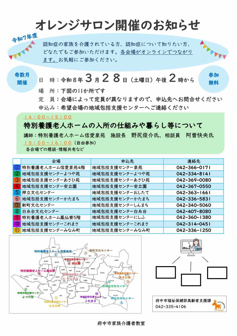 認知症の家族を介護されている方、認知症について知りたい方、どなたでも参加いただけます。各会場と講師がオンラインでつながります。奇数月に開催しておりますので、お気軽にご参加ください。詳細につきましては、お近くの地域包括支援センターへお問い合わせください。