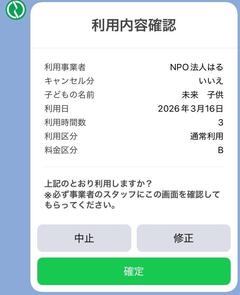 基本的には、利用当日の利用後に支援員にフォーム内の利用内容確認画面(画像のとおり)を確認してもらってから確定ボタンを押して時間数の消費を行ってください。