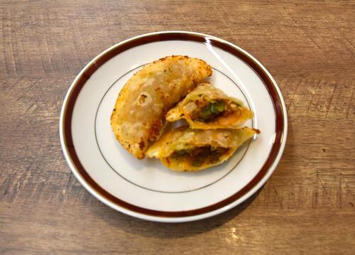 - 餃子の皮の外側1周水を塗り、半分に折り、すき間なく重ね、フォークでおさえる。