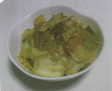 - 梨の皮と白菜をよく混ぜ、ごま油・カンタン酢をまわし入れる。