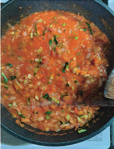 - にんにく、トマト缶を加え、全体を混ぜながら2分ほど煮込む。