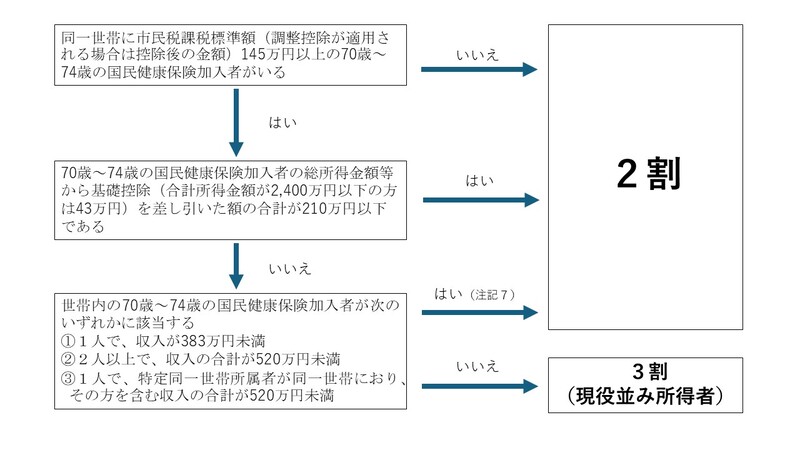 注記1:自己負担割合は世帯で判定します。同じ世帯の中に70歳~74歳の国民健康保険加入者が二人以上いて、一人でも3割負担の方がいる場合には、他の70歳~74歳の国民健康保険加入者も3割負担と判定します。