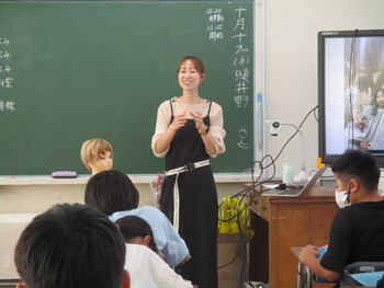 授業では、「府中のまちクリエイターノート3」第1章で紹介されている方々をはじめ、府中で活動している方や府中にゆかりのある方など、計6名の方をゲストティーチャーとしてお招きし、普段の活動や仕事の内容、その中で大切にしていることや想いなどについてお話をしていただきました。