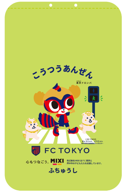 新たにFC東京のマスコットキャラクター「東京ドロンパ」と府中市の市民協働推進 キャラクター「きょうちゃん・どうちゃん」が、手を挙げて横断歩道を渡る独自デザインです。 素材は耐久性に優れた生地を使用し、雨の日にもランドセルを守る防水性能も備えており、蛍光黄色の鮮やかな色彩により、日中・夜間ともに 見やすさ視認性を確保し、機能性と安全性を兼ね備えた仕様となっています。