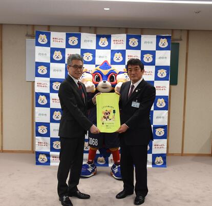 このたびはFC東京チームマスコットの『東京ドロンパ』と本市の市民協働推進キャラクター『きょうちゃん どうちゃん』をデザインしたランドセルカバーをご寄贈いただき心より御礼申し上げます。