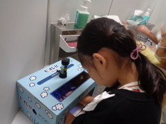 その後、ブラックライトが当たるボックスに手を入れてみると、洗い残した部分が白く光ります。洗い残しを確かめた後、正しい手洗いの仕方を学習します。