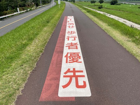 路面標示「(自転車は) スピード落せ 歩行者優先」